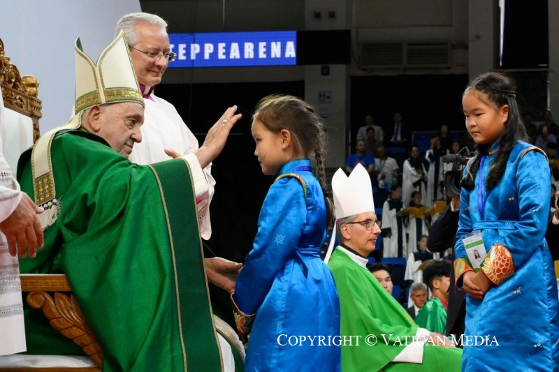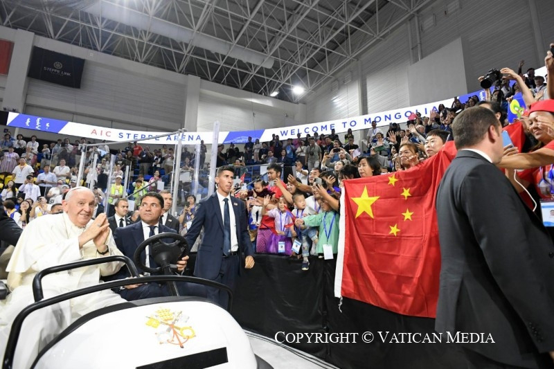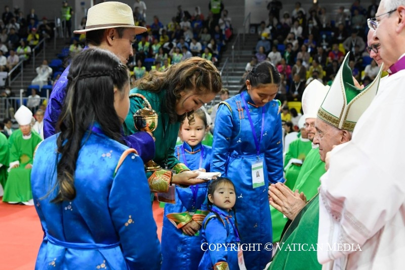 Köszönöm, Eminenciás Püspök Úr, a szavait, és köszönöm az ajándékotokat! Ön azt mondta, hogy ezekben a napokban saját szemével láthatta, mennyire kedves számomra Istennek Mongóliában élő népe. Igaz, nagy várakozással indultam el erre a zarándoklatra, azzal a vággyal, hogy találkozzam veletek és megismerjelek benneteket, és most hálát adok Istennek értetek, mert rajtatok keresztül ő szeret nagy dolgokat véghezvinni a kicsiségben. Köszönöm nektek, hogy jó keresztények és becsületes polgárok vagytok. Menjetek előre, szelíden és félelem nélkül, érezve az egész Egyház közelségét és bátorítását, és mindenekelőtt az Úr gyengéd tekintetét, aki senkiről sem feledkezik meg, és szeretettel tekint minden egyes gyermekére.