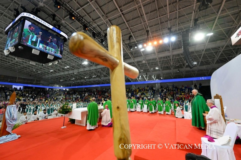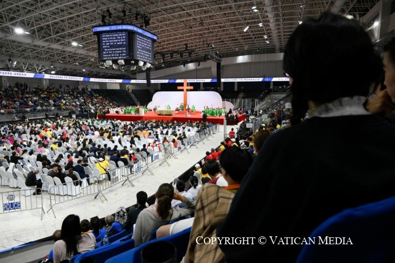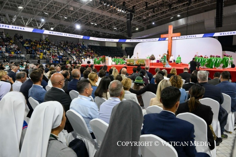Ez az az igazság, melynek felfedezésére Jézus hív bennünket, amelyet Jézus mindannyiatoknak, Mongólia egész földjének fel akar tárni: nem kell nagynak, gazdagnak vagy erősnek lenned ahhoz, hogy boldog légy: nem! Csak a szeretet oltja teljesen szívünk szomját, csak a szeretet gyógyítja be sebeinket, csak a szeretet ad igazi örömet. Ez az az út, amelyet tanított nekünk és megnyitott számunkra Jézus. Mi is, testvéreim és nővéreim, halljuk meg azt a mondatot, amelyet az Úr Péternek mond: „Menj mögém” (Mt 16,23), vagyis: légy a tanítványom, járd azt az utat, amelyet én járok, és ne a világ szerint gondolkodj többé. Akkor képesek leszünk Krisztus és a Szentlélek kegyelmével a szeretet útján járni. Akkor is, amikor