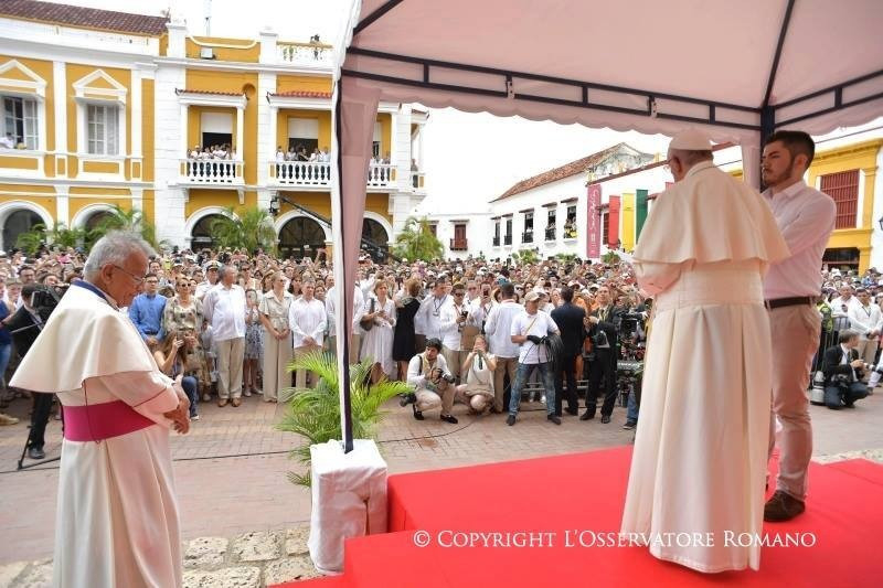 Kevéssel azelőtt, hogy beléptem ebbe a templomba, ahol Claver Szent Péter ereklyéit őrzik, megáldottam rendkívüli szegénységben élő emberek ellátására szánt két intézmény alapkövét, és meglátogattam Lorenza asszony házát, ahol ő mindennap számos fivérünket és nővérünket fogadja, hogy ételt és szeretetet adjon nekik. Ezek a találkozások nagyon jót tettek nekem, mert ezeken a helyeken kézzelfogható Isten szeretete, amely konkréttá, mindennapivá teszi magát.