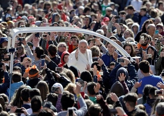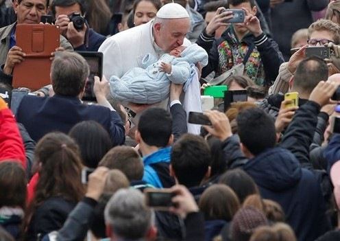 Kereszténynek lenni azt jelenti, hogy nem a halálból indulunk ki, hanem Isten irántunk tanúsított szeretetéből, aki legyőzte legádázabb ellenségünket. Isten nagyobb a semminél; egyetlen meggyújtott gyertya elég, hogy legyőzze a legsötétebb éjszakát is. Pál a prófétákat visszhangozva azt kiáltja: „Halál, hol a győzelmed? Halál, hol a fullánkod?” (1Kor 15,55). Ebben a húsvéti időszakban hordjuk szívünkben ezt a kiáltást! Ha pedig megkérdezik tőlünk, miért van arcunkon mosoly, és miért vagyunk ilyen türelmesek az osztozásban, azt válaszolhatjuk: azért, mert Jézus ma is itt van, ma is itt él köztünk, Jézus ma is itt van velünk a téren. Ő feltámadottként ma is él!
