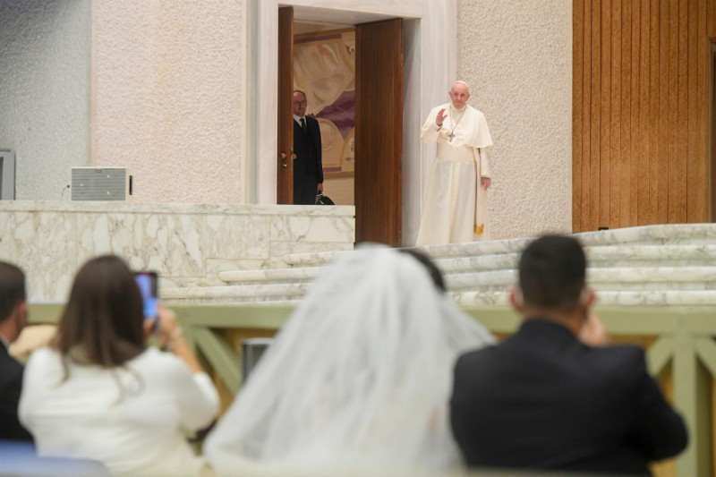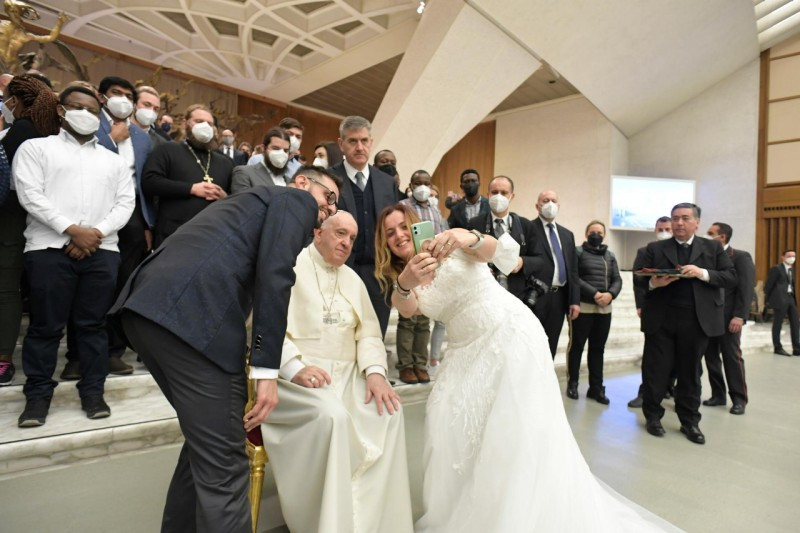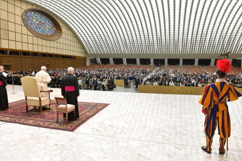 A mai általános kihallgatás végén a Szentatya nem tudta a szokásos módon köszönteni a VI. Pál teremben a lépcső előtt tartózkodó hívőket. A pódium szintjéről a pápa a termen kívül, vélhetően lifttel ment le a terem szintjére, és a teremben középen egy széken ülve üdvözölte a hívőket.