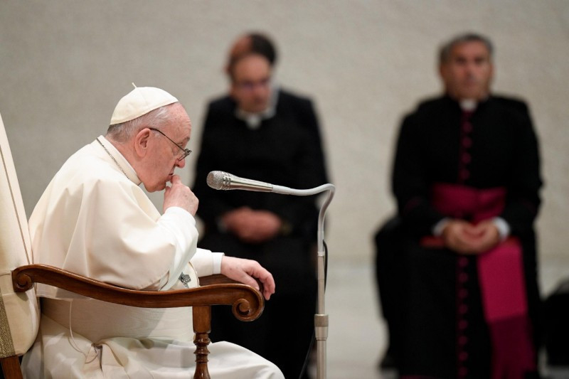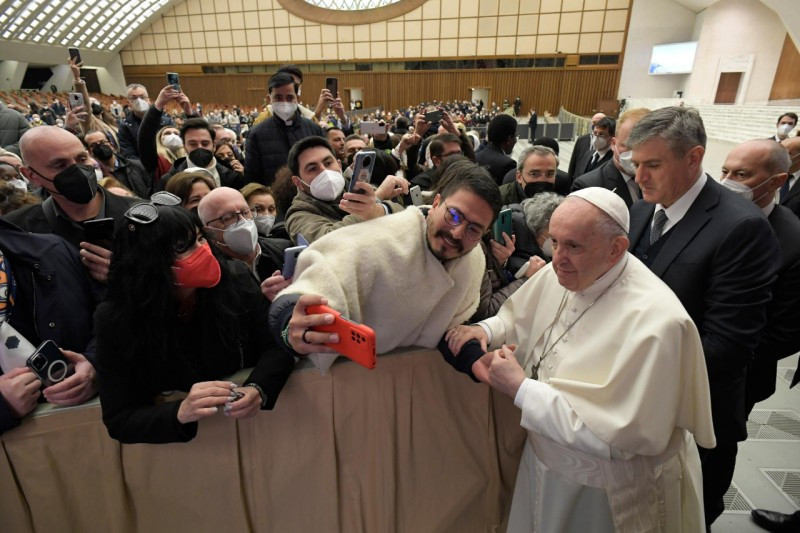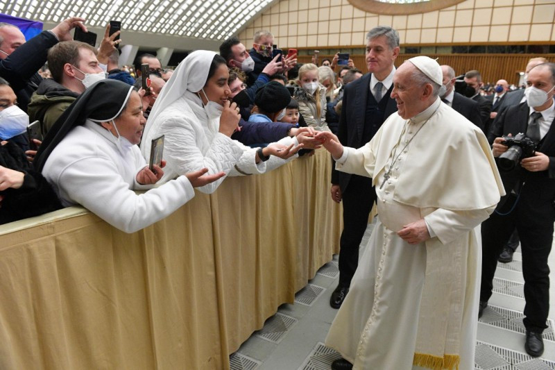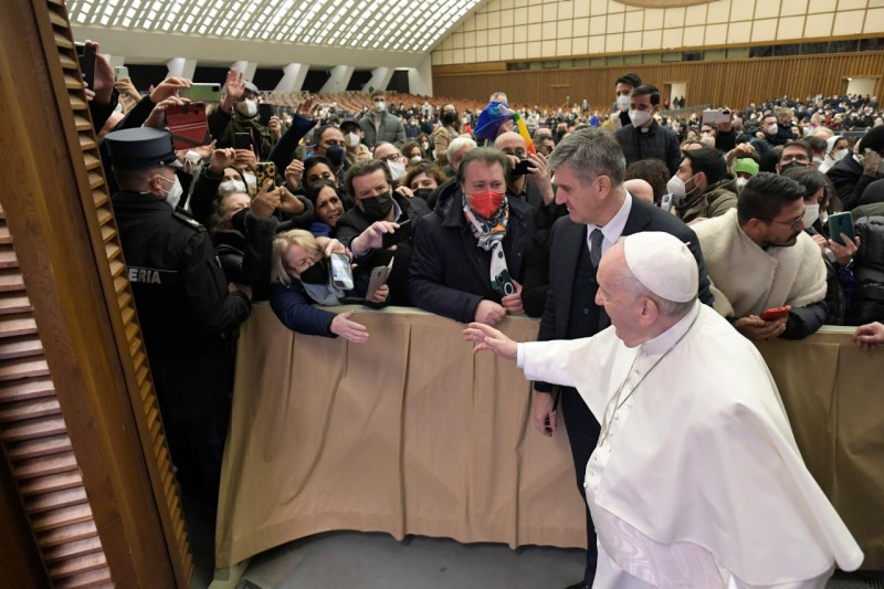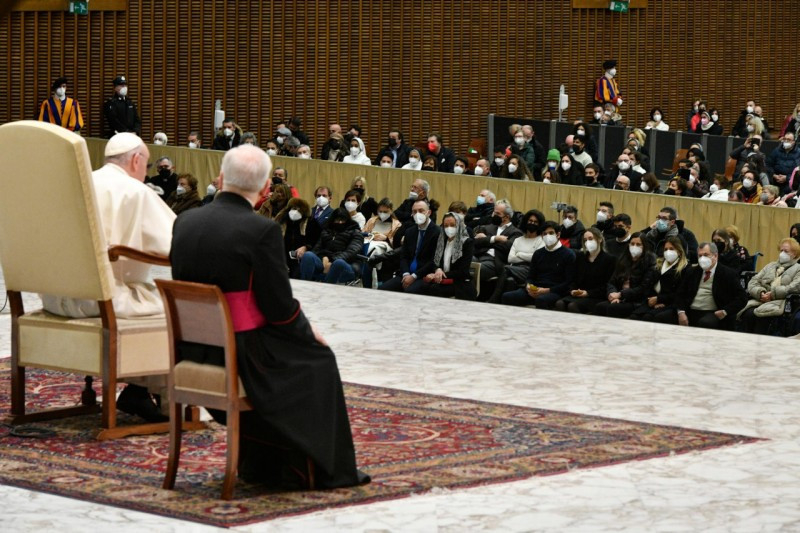 Ferenc pápa a következőket mondta: „Hadd magyarázzam el nektek, miért nem tudok ma közétek menni, hogy üdvözöljelek benneteket: gond van a jobb lábammal; a térdem egyik szalagja begyulladt. De lemegyek majd [a lépcső elé], és ott foglak üdvözölni benneteket, ti pedig odajöttök hozzám, hogy üdvözöljetek. Ez egy átmeneti dolog. Azt mondják, ez csak az öregekkel történik; nem is értem, miért történhetett ez velem…”