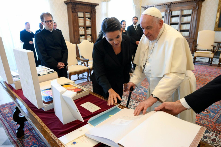 Németh Norbert elmondta: „Novák Katalin elnök asszony egy Kárpátalján készült ikont nyújtott át a Szentatyának, amely a Szűzanyát ábrázolja a kis Jézussal. Az ikont a kárpátaljai magyar közösség tagjai készítették azzal a céllal, hogy az elnök asszony – közvetlenül az Ukrajnában tett látogatása után – nyújtsa át a Szentatyának. Vagyis ezt az ikont azok a magyarok készítették, akik a háború miatt Ukrajnában szenvednek, és akik az ottani, kárpátaljai magyar közösség tagjai. Az elnök asszony a Szentatyának ajándékozta továbbá azt az albumot, mely a 2023-as áprilisi magyarországi pápalátogatásnak állít emléket színes fotókkal. Az album második példányát – Ferenc pápa ajánló soraival – Novák Katalin viszi haza Magyarországra.