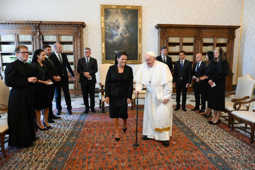 A köztársasági elnök emellett Magyarország zarándokhelyeinek apró kegytárgyait adta át Ferenc pápának egy kerámiából készült békegalambbal együtt, ami »rímel« arra az ajándékra, amit a Szentatya adott az elnök asszonynak: a pápa ez évi béke világnapi üzenete, amelyet 2022. december 8-án írt. Ezt kísérte egy bronzszobor, amelynek címe A béke hírnöke. Így tehát a béke szimbólumait nyújtották át egymásnak” – mondta el Németh Norbert.