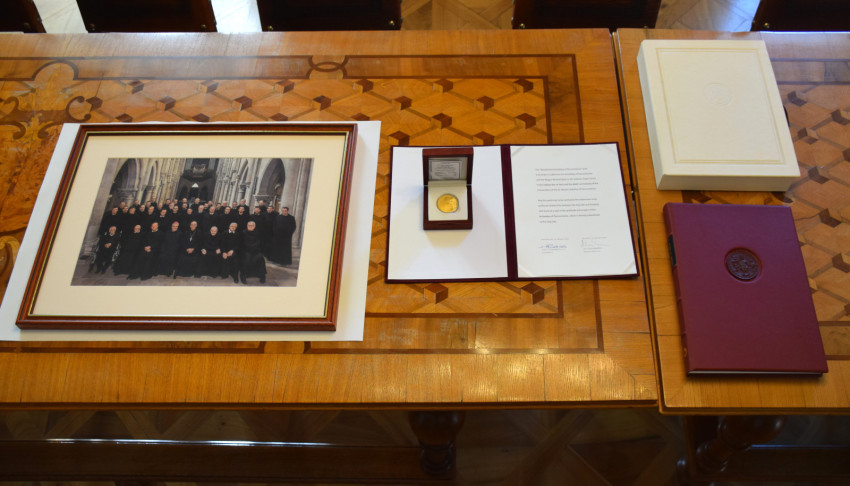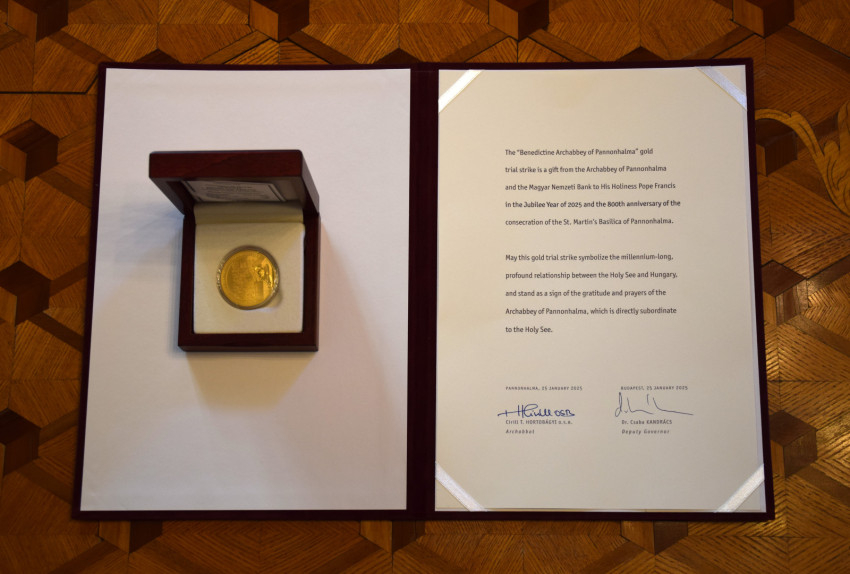 A delegáció a pannonhalmi Szent Márton-bazilika 800. évfordulójára készült Pannonhalmi Bencés Főapátság emlékérme arany próbaveretét adta át a Szentatyának az idei szentév alkalmából.