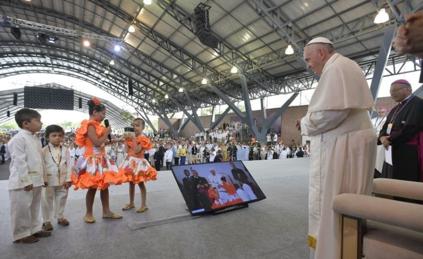 Pastora Mira, nagyon jól mondtad: egész fájdalmadat és sok ezer áldozat fájdalmát a megfeszített Jézus lábához akarod tenni, hogy hozzákapcsold az ő szenvedéséhez, és így áldássá, megbocsátó képességgé váljon, hogy megtörje a Kolumbiában uralomra jutott erőszak körét. Igazad van: az erőszak erőszakot szül, a gyűlölet gyűlöletet szül, és a halál újabb halált. Meg kell törnünk ezt az elkerülhetetlennek látszó láncolatot, és ez csak megbocsátással, konkrét kiengesztelődéssel lehetséges. Te, kedves Pastora, és sok más hozzád hasonló ember, megmutattátok, hogy ez lehetséges. Krisztus segítségével, az élő Krisztussal közösségünkben, le lehet győzni a gyűlöletet, le lehet győzni a halált, lehetséges az újrakezdés, és életet lehet adni egy új Kolumbiának. Köszönöm, Pastora, mekkora jót teszel ma velünk életed tanúságtételével! A bojayái feszület erőt adott neked a megbocsátáshoz és a szeretethez, segített, hogy az ingben, amelyet lányod, Sandra Paola ajándékozott fiadnak, Jorge Aníbalnak, ne csak a halál emlékét, hanem azt a reményt is lásd, hogy a béke végérvényesen győzni fog Kolumbiában. Köszönjük, köszönjük!