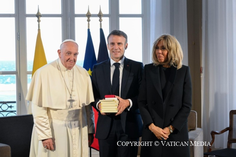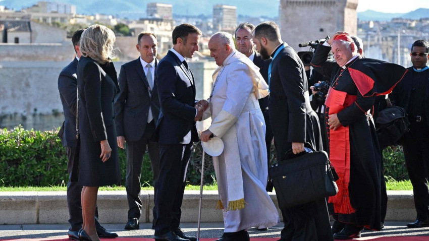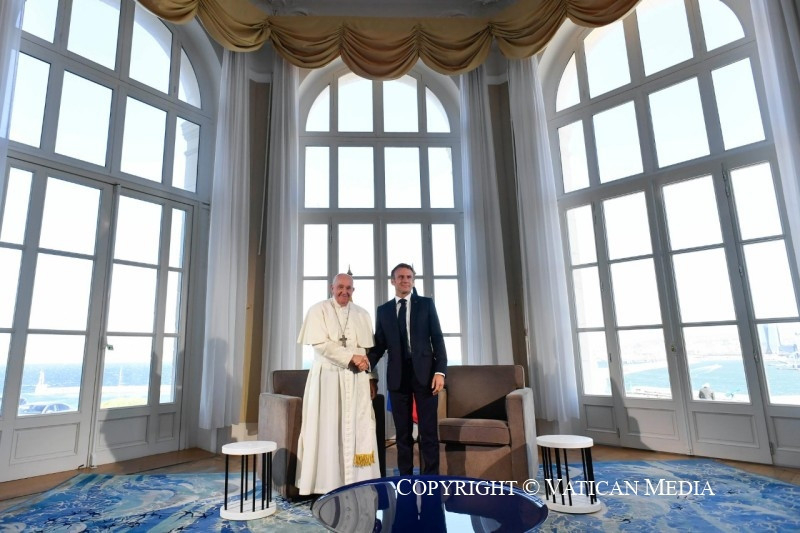 A Szentatyát Emmanuel Macronnal együtt felesége, Brigitte köszöntötte. Az elnök a nagyterem első sorában ült, ahol a pápa beszédet mondott a Földközi-tenger térségében fekvő országok ökumenikus és vallásközi találkozójának záróprogramján.