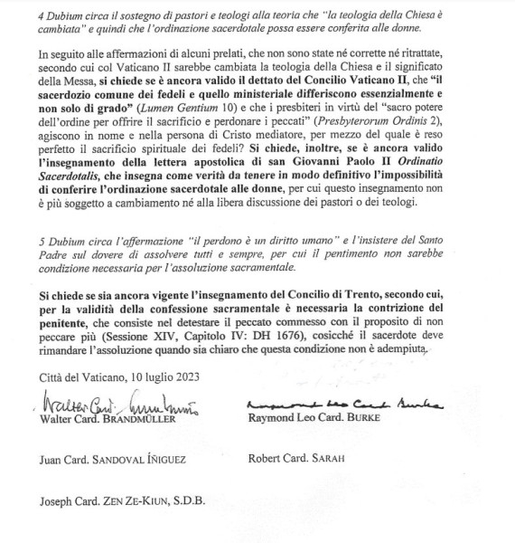 Egyes főpapok – se nem korrigált, se nem visszavont – kijelentései után, melyek szerint a II. Vatikáni Zsinattal megváltozott az Egyház teológiája és a mise értelme, felmerül a kérdés, érvényes-e még a II. Vatikáni Zsinatnak az a tanítása, hogy „a hívők általános papsága és a szolgálati papság lényegileg és nem csak fokozatilag különböznek egymástól” (Lumen gentium, 10), és hogy az áldozópapoknak „felszentelésük folytán hatalmuk van áldozatot bemutatni és bűnöket megbocsátani” (Presbyterorum ordinis, 2), a közvetítő Krisztus nevében és személyében cselekszenek, aki által a hívők lelki áldozata tökéletessé válik? Felmerül az a kérdés is, hogy érvényben van-e még Szent II. János Pál Ordinatio sacerdotalis kezdetű apostoli levele, mely végérvényesnek tartandó igazságként azt tanítja, hogy nőket nem lehet pappá szentelni őket, tehát ez a tanítás már nem változtatható meg, s nem lehet szabad vita tárgya a pásztorok és teológusok között.