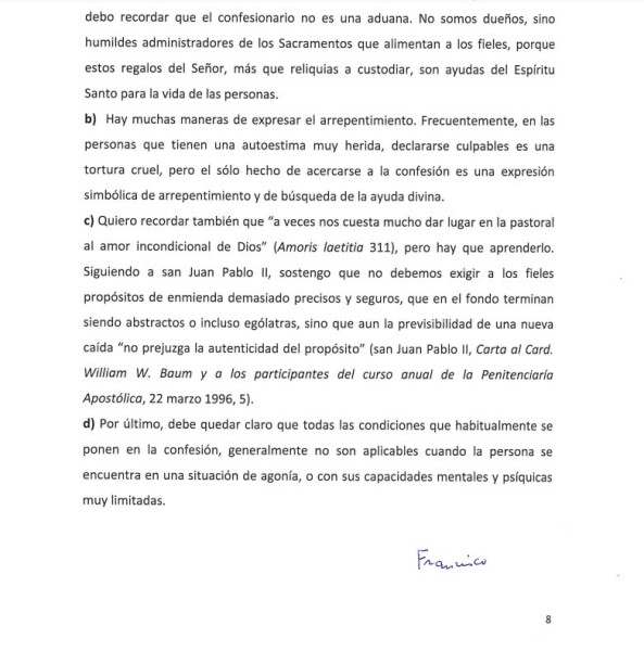 5. Kétely azzal a kijelentéssel kapcsolatban, hogy „megbocsátás emberi jog”, és a Szentatyának azon buzdításával kapcsolatban, hogy a gyóntatónak kötelessége mindenkit és mindig feloldozni, melynek következtében a bűnbánat nem lenne szükséges feltétele a szentségi feloldozásnak.