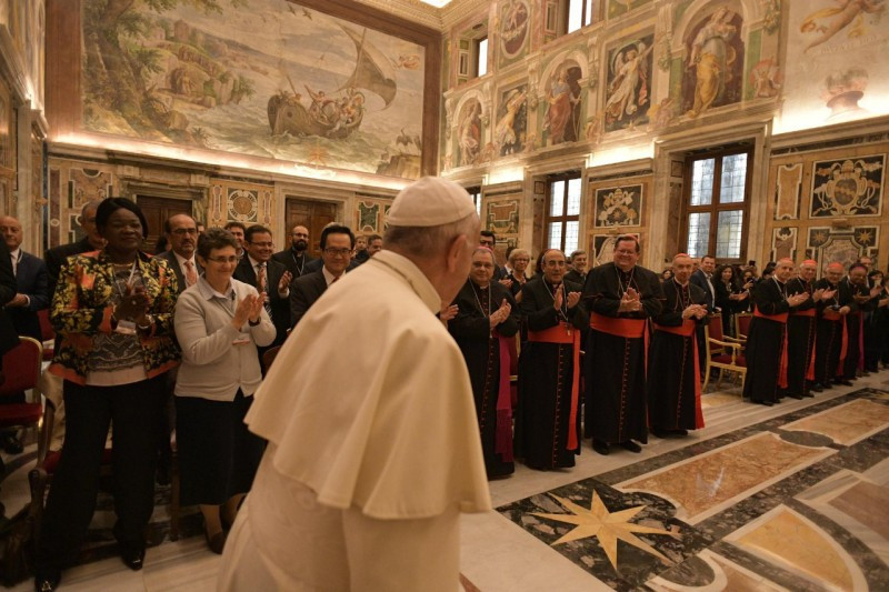 Mindannyian arra kaptatok meghívást, hogy működjetek együtt a Szentszékkel, hogy segítsétek ennek az új dikasztériumnak a munkáját, amely alig két éve kezdte meg tevékenységét, a Világiak Pápai Tanácsa és a Család Pápai Tanácsa örökségét viszi tovább. Mindannyian együtt, papok, szerzetesek, világi hívők egymás mellett álltok, hogy az egyetemes Egyházat szolgáljátok azzal, hogy a világiakat, a családokat, az életet pártoljátok, támogatjátok. Elengedhetetlen tehát, hogy mindannyian magatokévá tegyétek az Egyház szívét. Magatokévá tenni az Egyház szívét. Ehhez erőfeszítést kell tenni, hogy kilépjetek önmagatokból, és egy új, néhányatok számára talán szokatlan perspektívába helyezkedjetek.