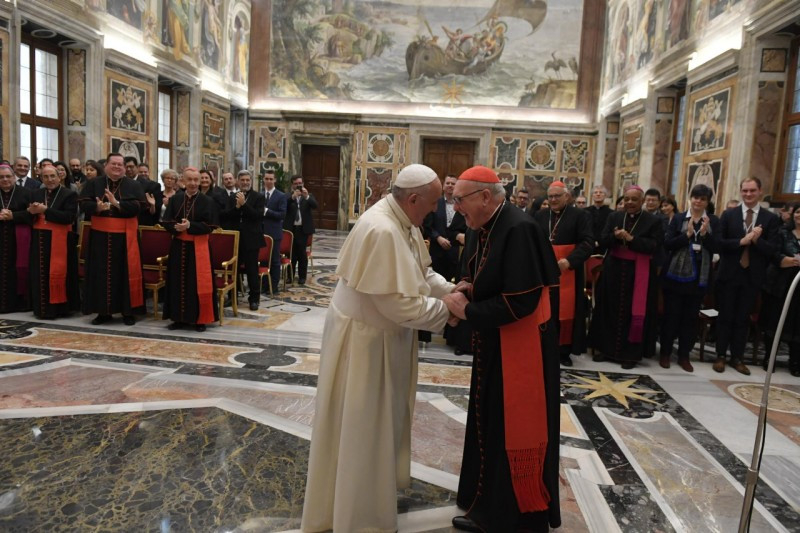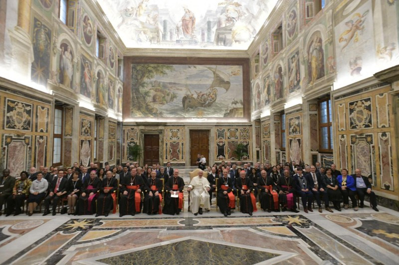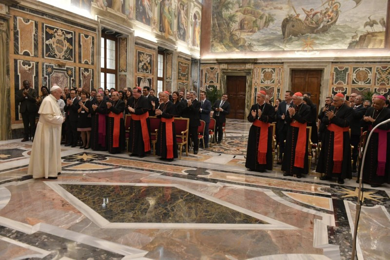 Mária segítségét és védelmét kérem számotokra. Köszönöm a szolgálatotokat, hogy elfogadtátok ezt a szolgálatot, és kívánom, hogy a Szentszékkel való együttműködésetek, a pápa szolgálatát segítve, személyes növekedés forrása legyen számotokra, és legyen nagyon termékeny az egyetemes Egyház számára. Szívbéli áldásomat adom rátok, és kérem imáitokat értem. Ne feledkezzetek meg róla. Köszönöm.