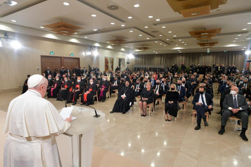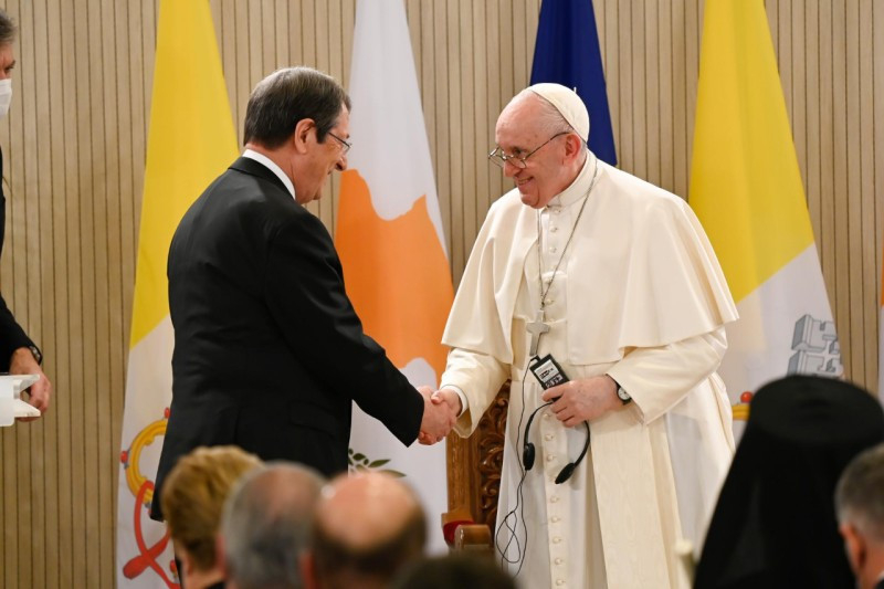 A Szentatya szólt a pandémia okozta gazdasági-pénzügyi nehézségekről, a korrupció elleni küzdelemről, az emberkereskedelem felszámolásáról. Az 1974 óta megosztott sziget békéjéért és egységéért imádkozik, melyhez elengedhetetlen a nyitott, őszinte párbeszéd. Félre kell tenni a múlt sérelmeit, elfogadni a nemzetközi közösség segítségét, hogy megmentsék a vallási és kulturális örökséget, és áthagyományozzák a jövő nemzedékre. Fontos lenne az emberek számára kedves szent helyek és tárgyak visszaszolgáltatása. „Hagyjuk magunk mögött a viszálykodást, és gyermekeinknek egy békés, együttműködő világot hagyjunk örökül, hogy a Földközi-tenger újra az ott élő népek tengere legyen, ahol Ciprus szigetén a békét építik!” – zárta a szigetország politikai vezetőihez intézett beszédét a pápa.