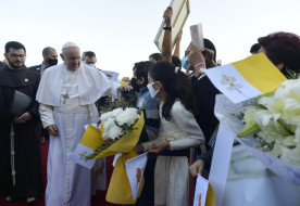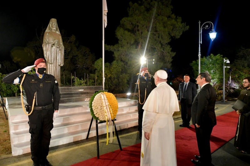 Zarándokként jöttem ebbe a földrajzilag kicsiny, de történelmileg nagy országba – kezdte beszédét a pápa. – Ciprus a civilizációk útkereszteződésében nyitott kapu, kikötő, mely összeköt, hivatása a találkozásra szólítja. Makariosz érsek, az első ciprusi elnök neve boldogot jelent, és Jézus szavait idézi eszünkbe a nyolc boldogságról. A boldogmondások pedig a kereszténység örök alkotmányát tárják elénk, boldogok a lélekben szegények, akiket az élet megsebzett, akik szelídek és irgalmasok, akik feltűnés nélkül gyakorolják az igazságosságot és a békét.
