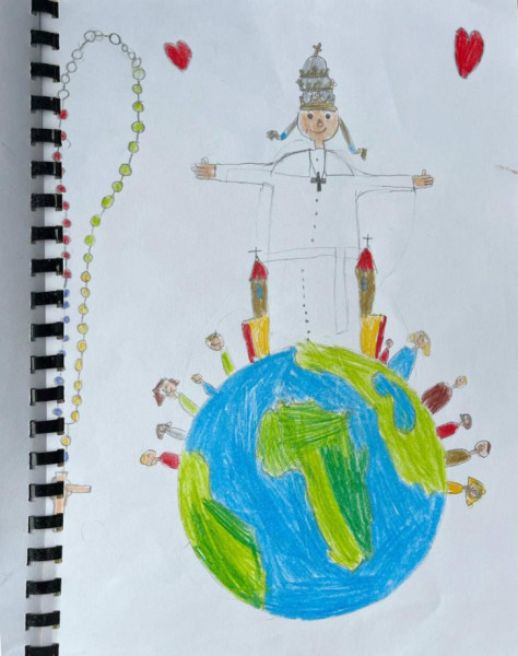 Többen azt ábrázolták, ahogyan a pápa a világért imádkozik. Az egyik kisgyerek a földet rajzolta le, felette az éggel, afölött pedig a ragyogó mennyországgal.