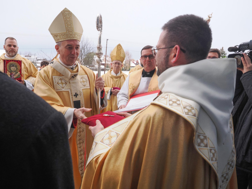 A főpásztor ünnepélyesen átadta az épület kulcsait Gere Dávid Márk SMC plébánosnak, aki kitárta az új templom ajtaját.