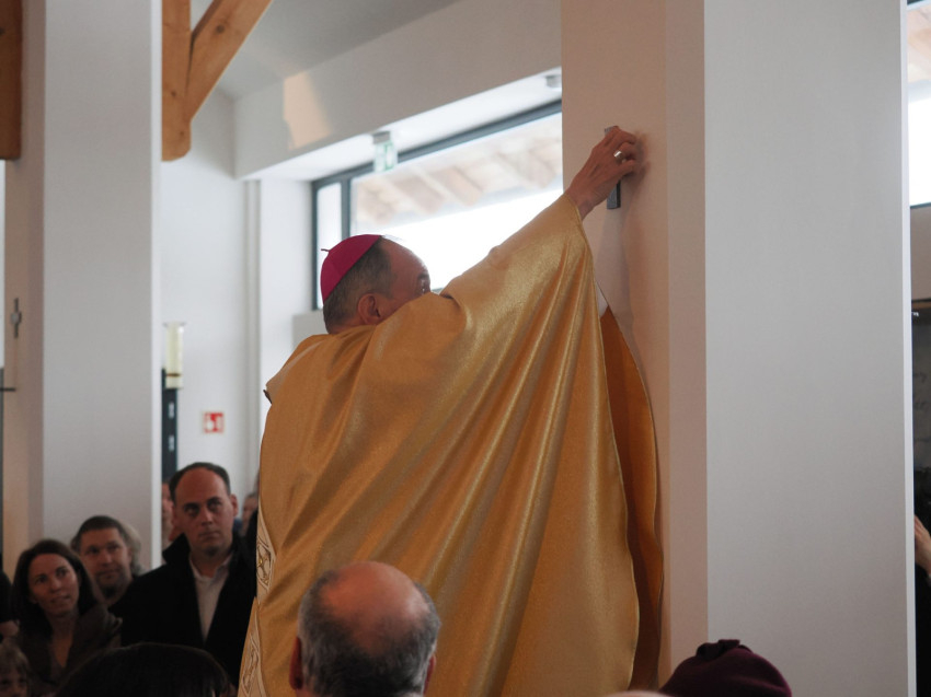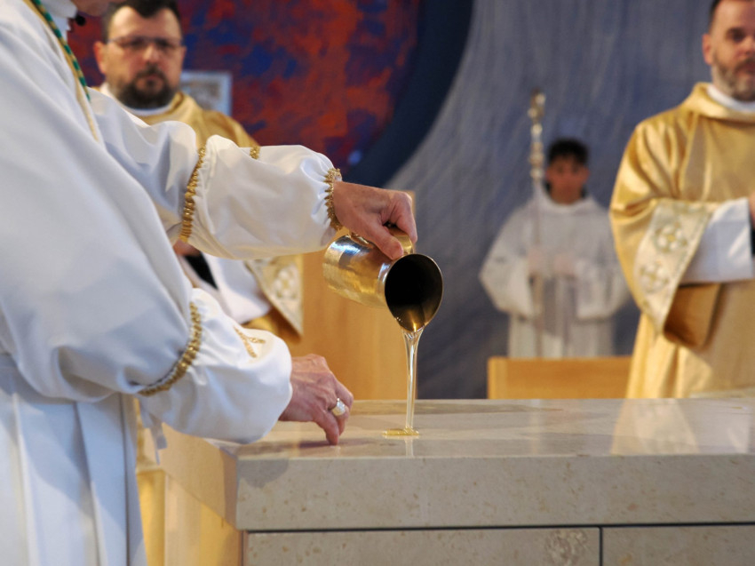 A templomszentelés liturgiájának egyik legmegrendítőbb pillanata az oltár krizmával való megkenése. A krizma, az Egyház legillatosabb és legszentebb olaja Krisztus erejét, jelenlétét és a Szentlélek kiáradását jelképezi. A főpásztor a szent olajjal kereszt alakban megkente az oltárt, ezzel felszentelve arra, hogy Isten és ember találkozásának helye, Krisztus áldozatának asztala legyen.