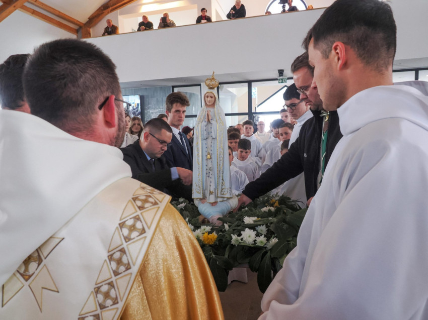 Az ünnepi liturgia a nemesvámosi Fatima-házban kezdődött, ahonnan körmenetben vitték az új templomba a Fatimából hozott Szűz Mária-szobrot.