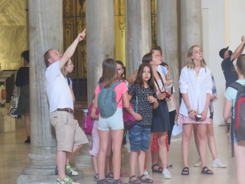 Majd amikor Ravennában a S. Apollinare Nuovóban elkezdtük megfejteni a mozaikábrázolások bibliai jeleneteit, s magyaráztam az egyes stílusjegyeket, ikonográfiai elemeket, azon kaptam magam, hogy a gyerekeknek ösztönösen a pasaréti templomra hivatkozva mutatom be: a szentek oltár felé „vonulása”, a bárányok, a pálmafák, a folyó képét, az azonosság miatt pedig ők pasaréti templomtapasztalatuk alapján érthették meg ezeket. És persze ott voltak a hétköznapi események, ahogy a nagyobbak terelgették a kisebbeket, a fagyizások, az étkezések, amikor jobban megismerhettem azok életét, akik a templom tőlem fizikailag legtávolabbi pontjáról, a kórusról végzik liturgikus szolgálatukat – tette hozzá a pasaréti plébános.