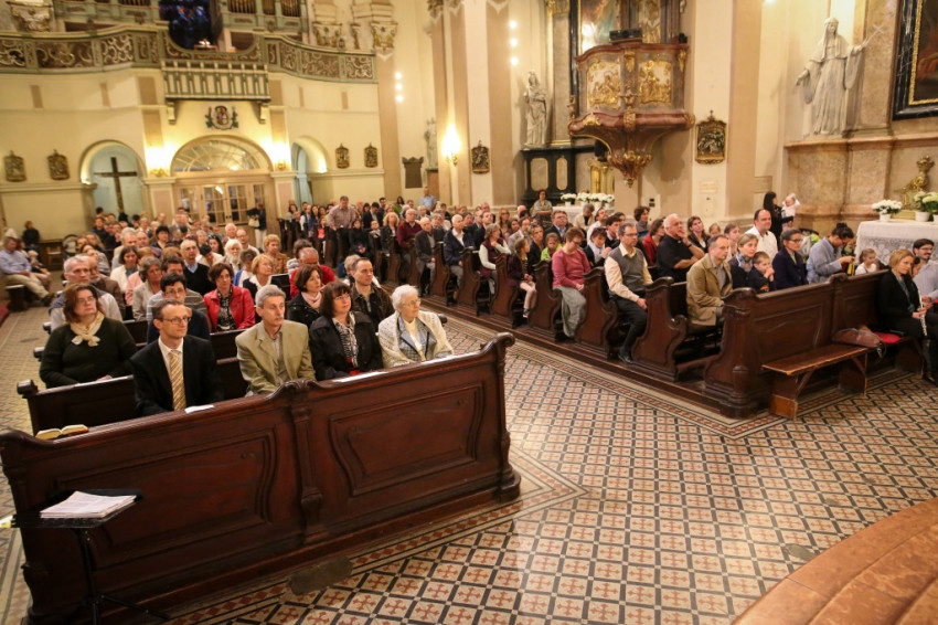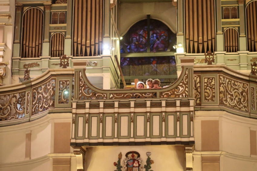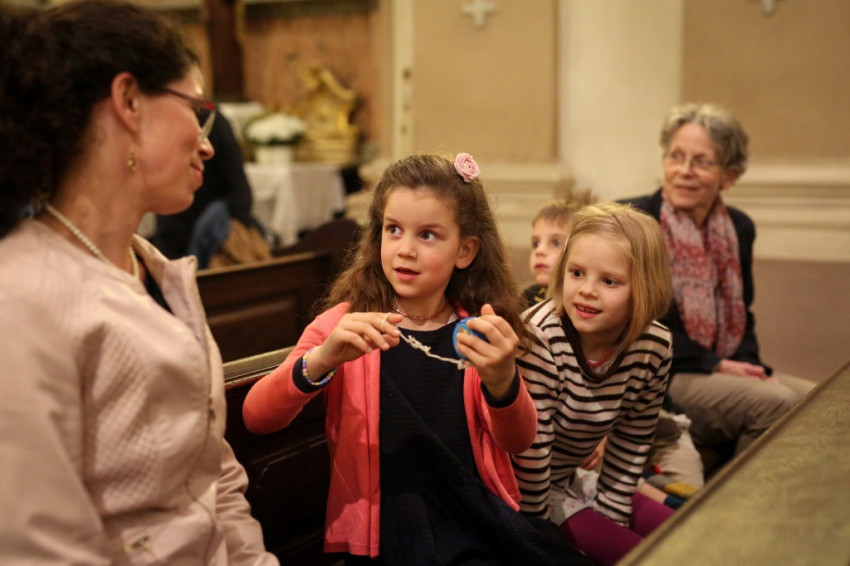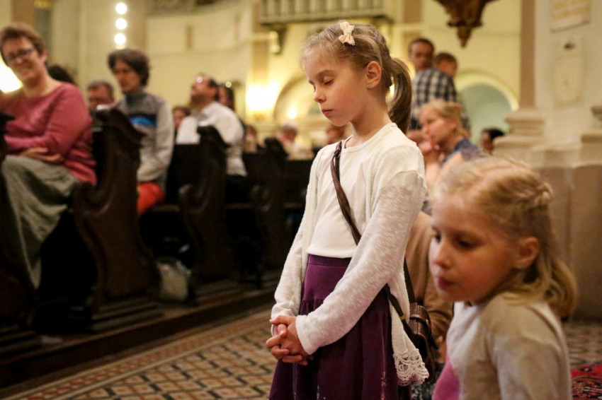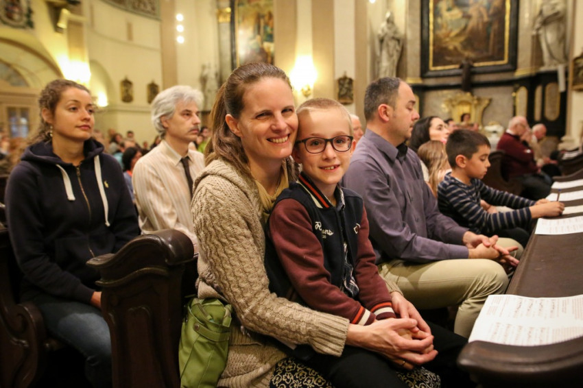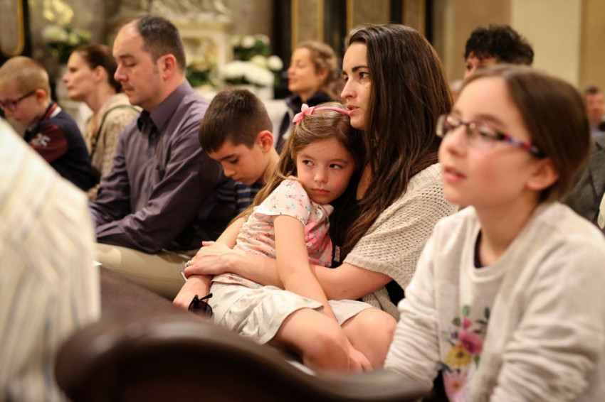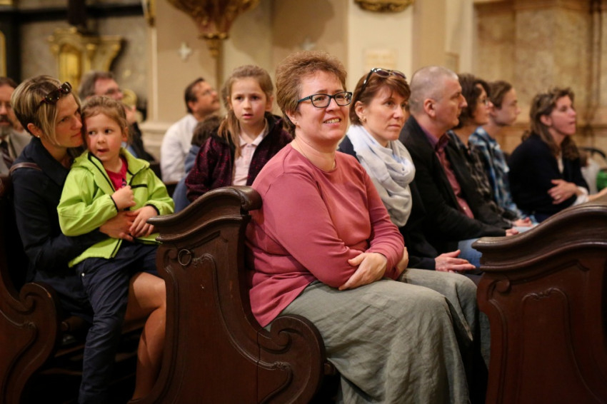 A sok gyerek jelenléte a legfeltűnőbb ezen a péntek esti misén. Mégis nagy a csend. Talán a legelevenebb gyerekekre hátul vigyáznak? Kolléganőm éppen egy komplett, az egész padot betöltő családot fotóz, annyira megragadja az orgonasípokhoz hasonló, kicsi, közepes és nagyobb gyerekek látványa, kedvessége. Úgy tűnik, nekik sincs ellenükre az érdeklődése.