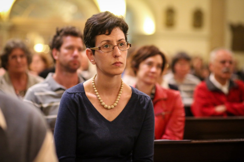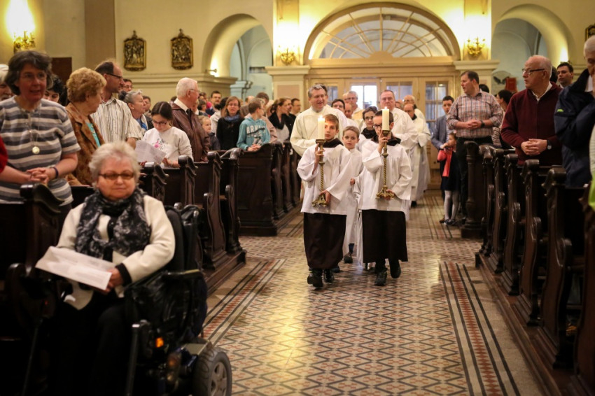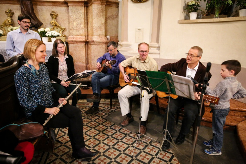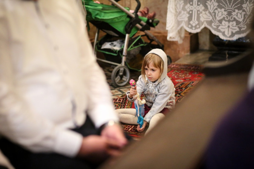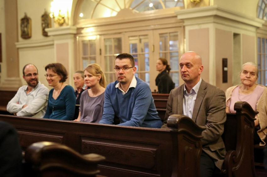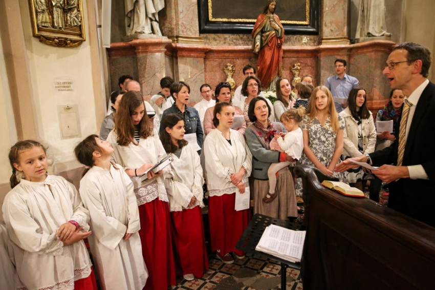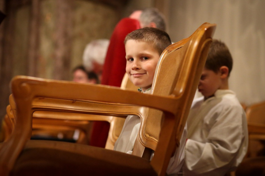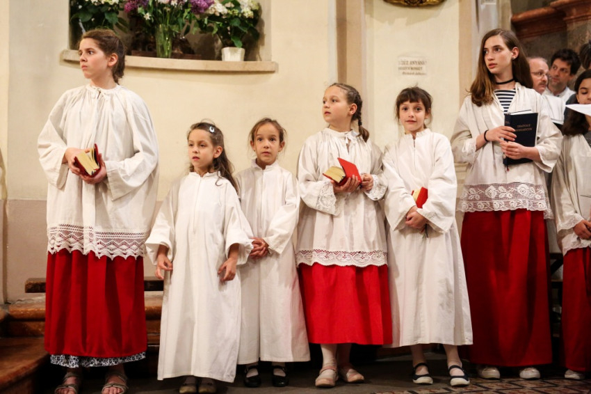 A sok gyerek jelenléte a legfeltűnőbb ezen a péntek esti misén. Mégis nagy a csend. Talán a legelevenebb gyerekekre hátul vigyáznak? Kolléganőm éppen egy komplett, az egész padot betöltő családot fotóz, annyira megragadja az orgonasípokhoz hasonló, kicsi, közepes és nagyobb gyerekek látványa, kedvessége. Úgy tűnik, nekik sincs ellenükre az érdeklődése.