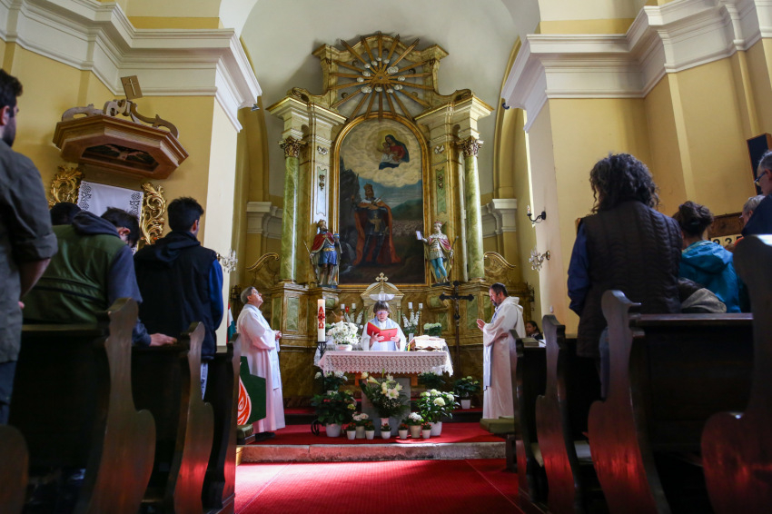 „Távkalauzunk”, Varga Miklós Péter regnumi atya a telefonban már pénteken mindkettőnknek külön-külön elmondja, hogyan találhatunk majd rájuk autóval, ami azért lehet bajos, mert hol itt, hol ott lesznek az erdőben. Olyan helyneveket sorol, amelyek az autót vezető kollégának nem sokat mondanak. Megtudjuk, hogy pihenőt fognak tartani a Kaán-forrásnál, aztán egyszer csak felbukkannak az Apátkúti-völgy bejáratánál, és végül a Magda-réten lesz a kiscsoportos beszélgetés. Hol várhatnak bennünket a megjelölt pontok közül? – kérdezi Péter atya. Na ez az, amit nem tudunk. Addig-addig aggodalmaskodunk, hogy ebből nem lesz erdei randevú, hogy végül úgy döntünk, inkább már kilenckor, a pilisszentlászlói napindító misén csatlakozunk hozzájuk. Mise után én a zarándokokkal tartok, Attila, a fotóriporterünk pedig autóval, kerülőúton jön utánunk a helyszínen kapott információk alapján.