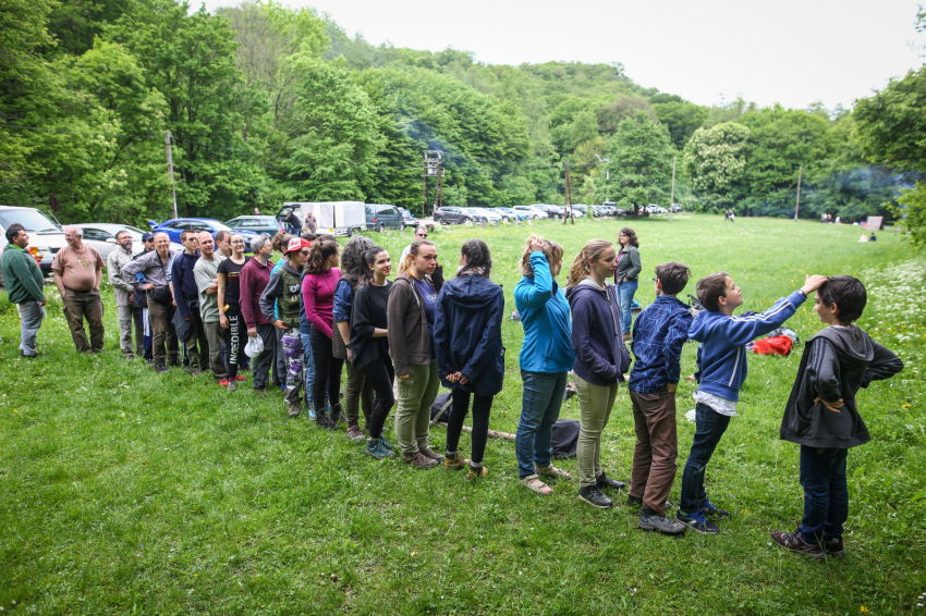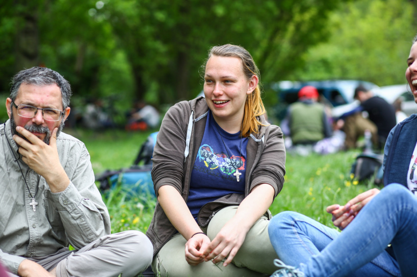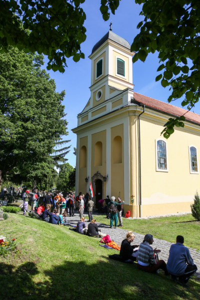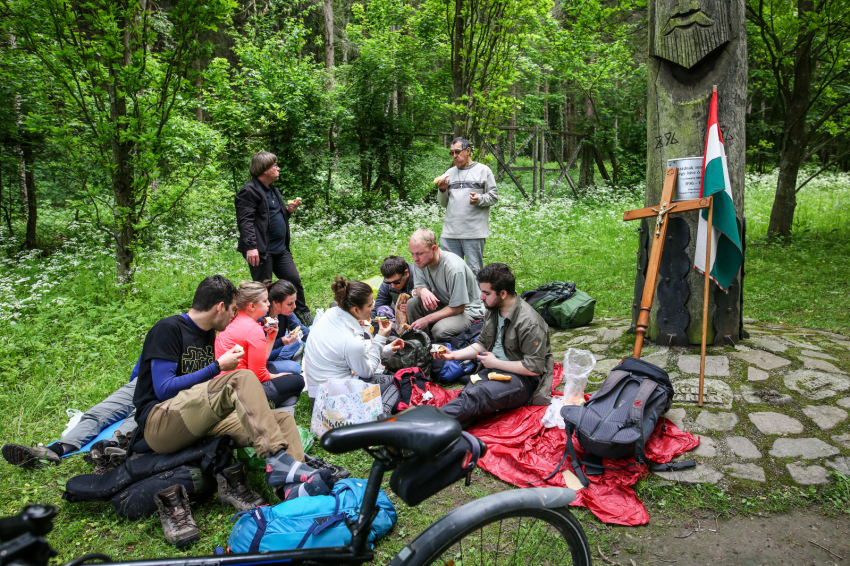 Édeni, szélein hatalmas fák által őrzött rétre érkezünk. A plébániai csoportok egykettőre megterítenek, és a soroksár-újtelepiek bennünket is kedvesen és bőségesen megvendégelnek. Közben azért én portyázgatok: a régi zarándoklatokról kérdezem például Koller Mariannt, aki 1986-ban volt először, és azóta harminckétszer újra. Ő a régi, úgynevezett kutyaólsátrak felállításának nehézségeiről számol be, majd a csehszlovák hálózsákokban való didergés élményére tér ki, ami ellen a három zokni sem sokat használt. Aztán Bertalant, a mise prédikátorát szólítom meg, aki nem zarándoktípus ugyan, de időnként fontosnak tartja a megszokott környezetből való kiszakadást, a lelki és a testi erőfeszítések összekapcsolását, a lelkigyakorlatnak ezt a rendhagyó típusát.