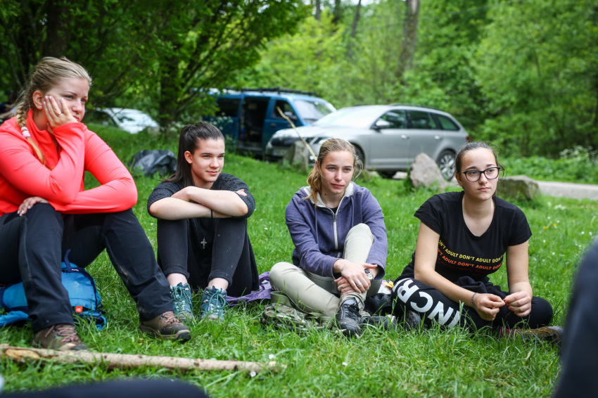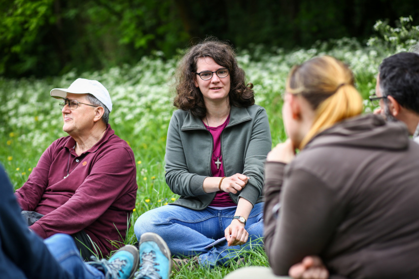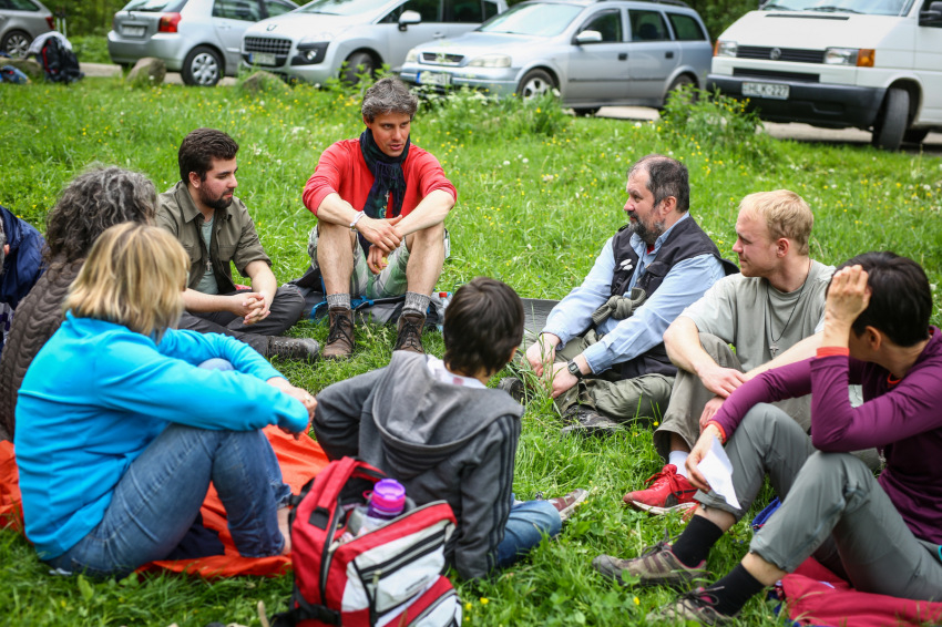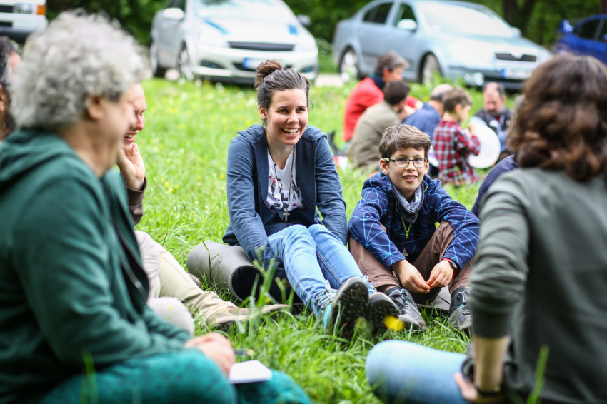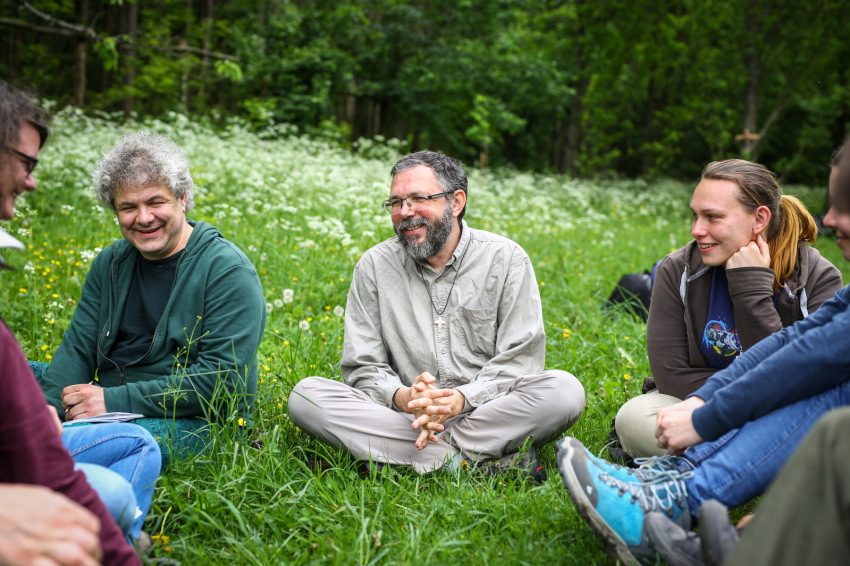 Bő félórával később kiscsoportos beszélgetés kezdődik, én a hármas csoport „kültagja” leszek. A táskámra ülök, mégis azonnal szembesülök a rét lakóinak élénk életével. A kezemre, majd a karomra zöld hernyócska mászik, a lábamon fekete cincérszerűség őrjáratozik, és valami nagyon meg is csíp.