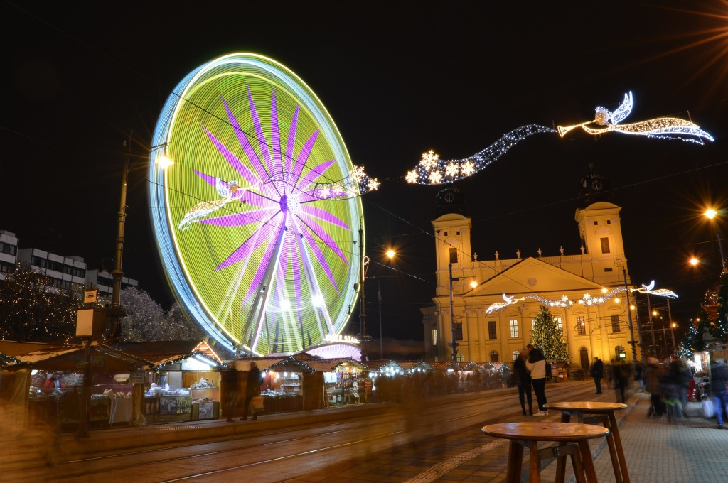 Debrecen főterén hatalmas, változó színekben játszó óriáskerék várja a karácsonyi vásár látogatóit. Bár a Nagytemplom jó 15 méterrel magasabb, a forgó látványosság vizuálisan egyértelműen háttérbe szorítja a város jelképének és legfontosabb nevezetességének számító egyházi épületet. A hazai települések nem hivatalos versenyében a cívis város újabb pontot szerez az ország legnagyobb mobil óriáskerekének felállításával. Szimbolikus küzdelem zajlik a főtéren? Az évszázadokon át a kálvinista irányzattal áthatott puritán életszemléletet valami más váltja fel Debrecenben? Sokszínűség, csillogás, külsőségek? A megújulás vagy az uniformizálódás felé kacsingat az „ősi város”?