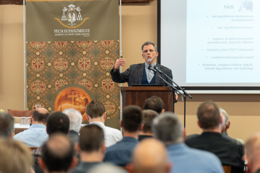 A nő olyan hitvest keres, akire felnézhet, akitől biztonságot remél; a férfi pedig ehhez ad keretet, melyben önmagán túlmutató víziója van az életről és stabil elképzelése a világról. A nő és férfi így kiegészíti egymást, így a kör bezárul, a szövetség beteljesül. De miből támad a zavar nő és férfi között? – tette fel a kérdést az előadó. – A férfiakra a bal agyfélteke dominanciája jellemző, ami általánosságban logikus gondolkodást és érvelést feltételez, továbbá a tények és információk, érvek dominanciáját, és feladatorientált küldetéstudatot határoz meg.
