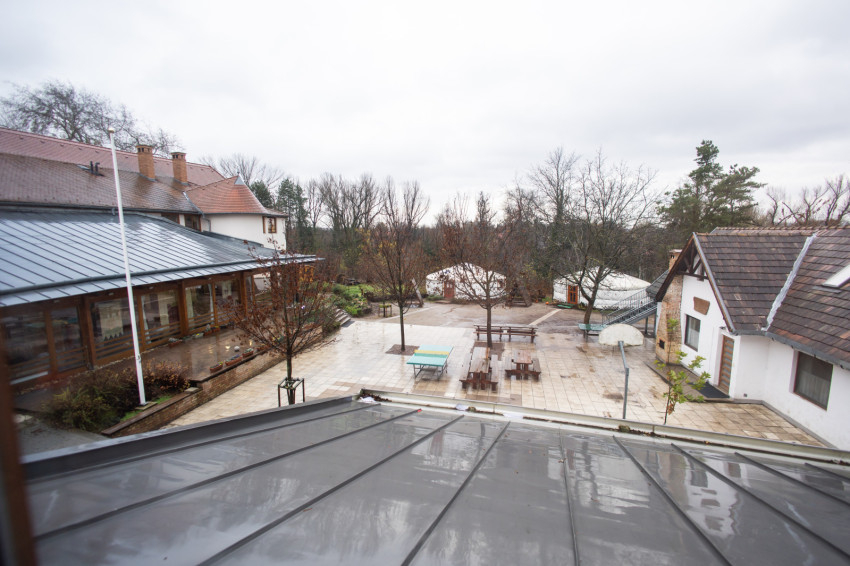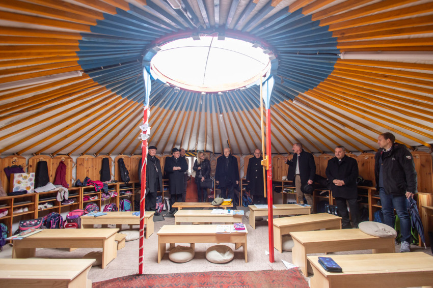 A találkozás során meglátogattuk az iskola kertjében felállított jurtát, amit osztályteremnek rendeztek be, fűthető, és érződik, mennyire bensőséges, ősi a hangulata. A gyerekek, amikor itt vannak, leteszik a cipőiket, táskáikat, és leülnek a kis asztalokhoz a sámlira. A fény felülről jön be, nagyon egyedi az egész centrális tér.