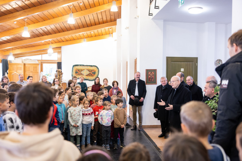 A szentmise után megérkeztek a püspökök és érsekek a Búzaszem Iskolába, ahol az igazgató, Horváth Szilárd és pedagógusok fogadták őket. Az épület tágas előterében éppen mozgásos-énekes foglalkozás folyt, a diákok hosszú köteleket feszítettek ki a bokáikkal, ezt ugrották át tánclépésekkel a többiek.