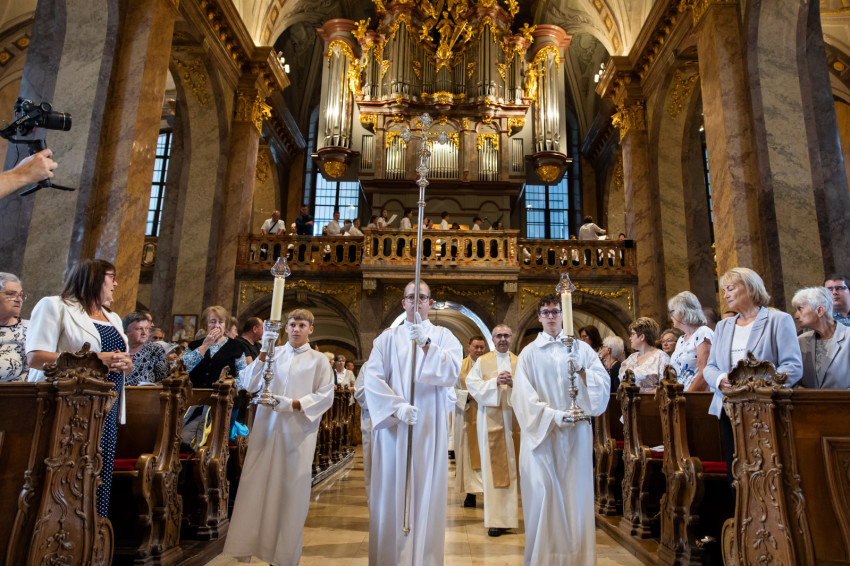 A szertartásra bevonuló papságot és az asszisztenciát Michael W. Banach nuncius; Veres András győri megyéspüspök és Pápai Lajos nyugalmazott győri megyéspüspök vezette. Felcsendült Sillye Jenő A világnak Krisztus kell kezdetű dala, amely a zsinati mottónak („Emlékezz, te Krisztushoz tartozol!”) is ihletője volt.