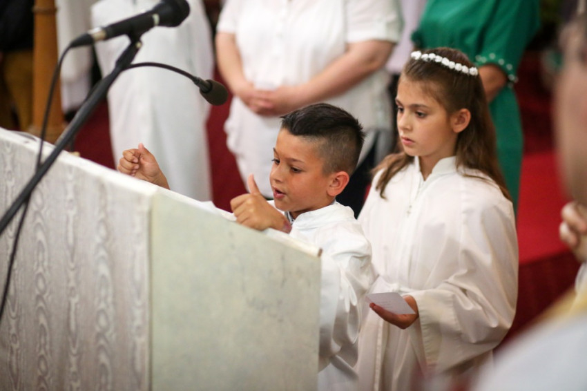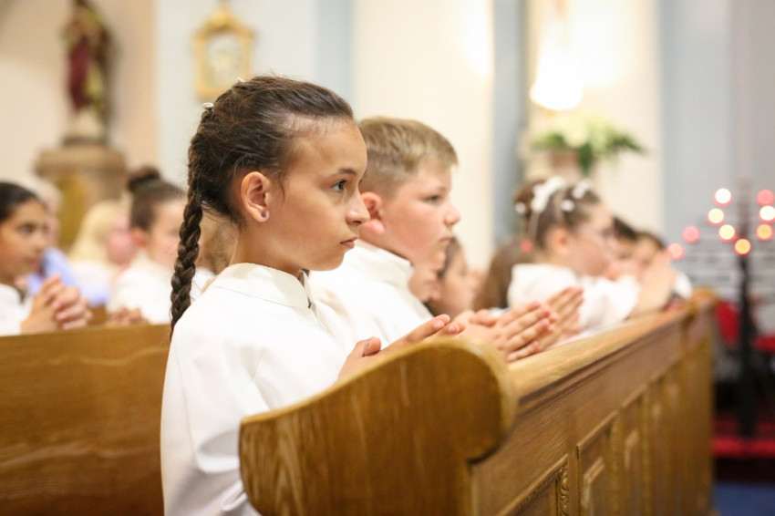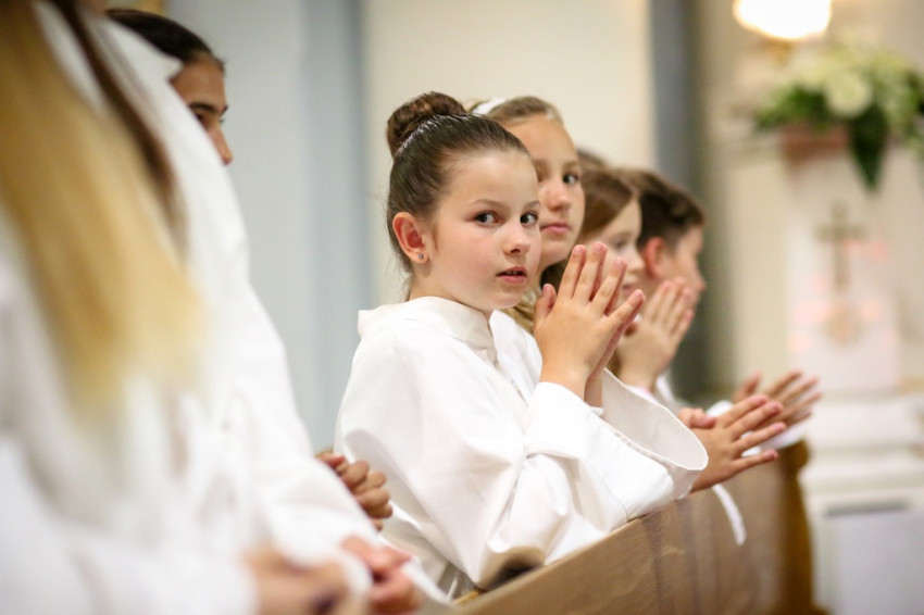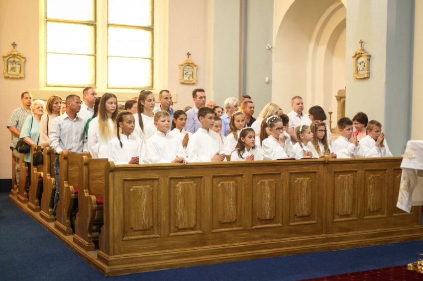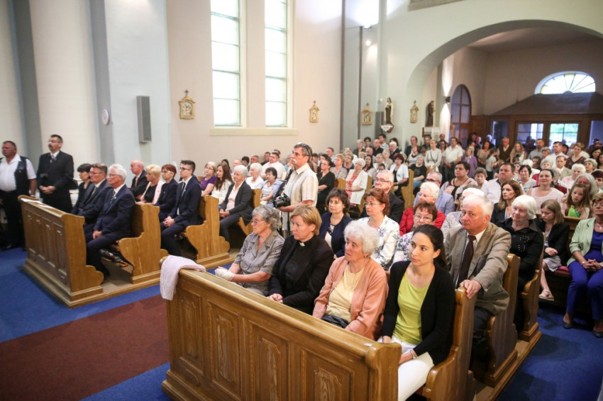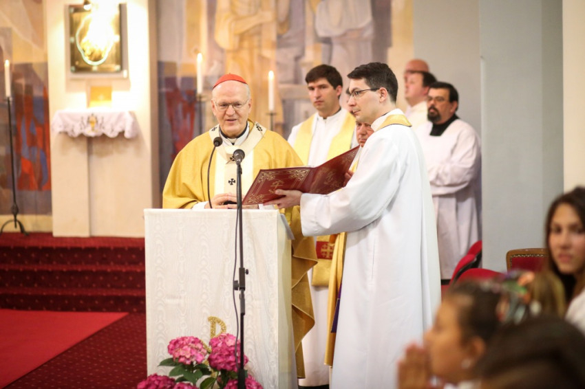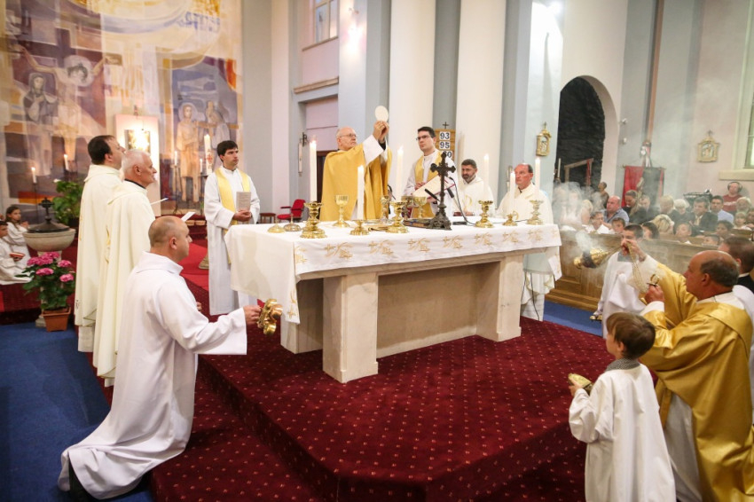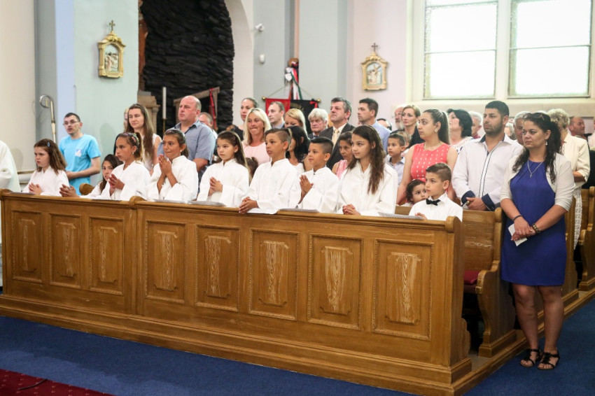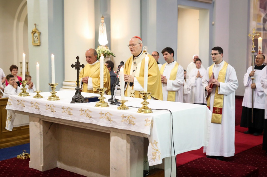 A konferencia befejeztével a jelenlévők nagy többsége átvonult a közeli Szent Borbála-templomba, ahol Erdő Péter bíboros, prímás főcelebrálásával mutattak be szentmisét. A környező egyházközségek fiataljai közül huszonhatan először járulhattak szentáldozáshoz. Szerencsés Zsolt tiszteletbeli kanonok, a templom plébánosa köszöntötte a főpásztort. Ezt követően Erdő Péter bíboros szólt az elsőáldozó fiatalokhoz, üdvözölte a testvéregyházak képviselőit és a városi és megyei vezetőket.