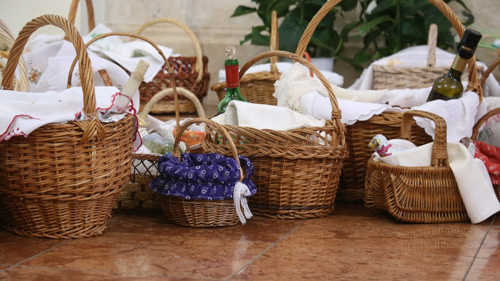 A családok nagy, virágokkal feldíszített kosarakban vitték el a szentelésre a szépen összekészített és hímzett terítővel letakart étket: a böjti időszakban füstölt sonkát, kolbászt, a hagymahéjjal festett vagy viasszal írt hímes tojásokat, a kemencében sütött, kereszttel díszített pászkát, a vajból formázott bárányt, a reszelt tormát, a sajátosan húsvéti eledelt, a tejből és tojásból főzött sárgatúrót. A kosár mellé külön kancsóban odakészítették a házi bort.