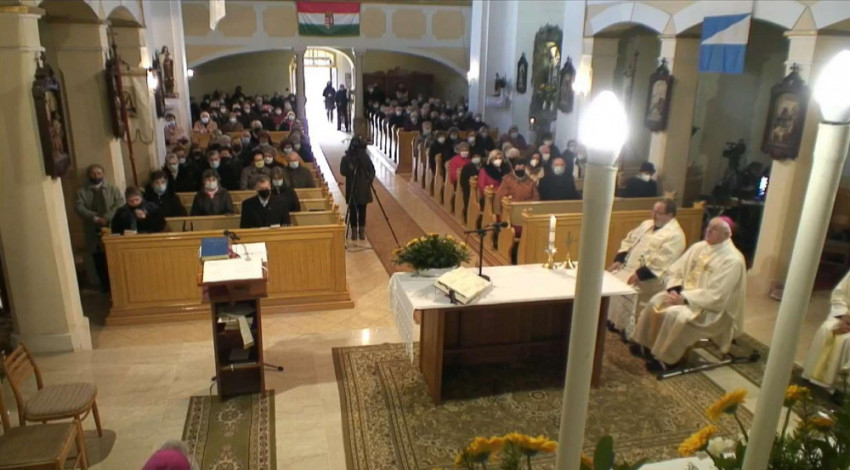 Az ünneplőkkel koncelebrált Felföldi László pécsi megyéspüspök, a szertartás szónoka, valamint Bíró László nyugalmazott tábori püspök és Petkó Tamás, a Szent Mihály-templom plébánosa.