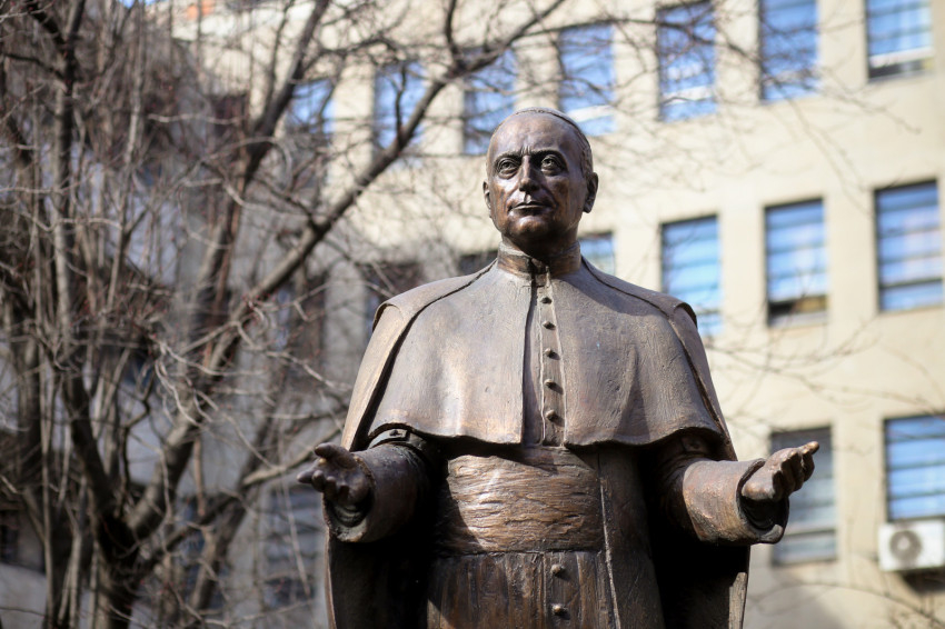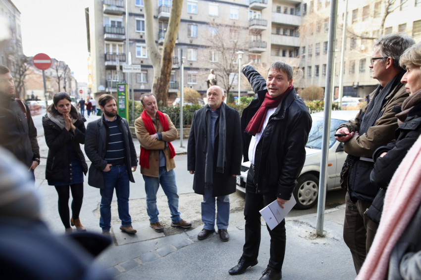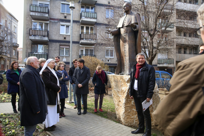 A bejárásra gyülekező csoport tagjaival – köztük Vízi Elemér jezsuita tartományfőnökkel és Sajgó Szabolcs jezsuitával, a Mindszenty Alapítványnak helyet adó Párbeszéd Háza igazgatójával – Hermann Zsolt Mindszenty-szobránál találkozunk, a Józsefváros kellős közepén, a bíborosról elnevezett téren.