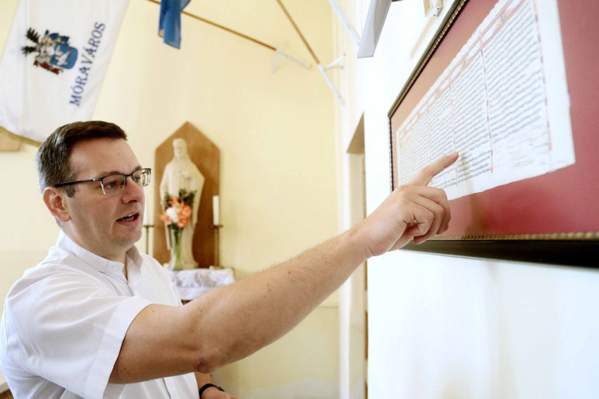 „Nagyon szép keretben volt, ebből gondoltam, hogy fontos dokumentum lehet a szétázott papír, aztán amikor kiderült, hogy mit tartok a kezemben, nagyon meghatódtam” – kezdte a beszámolót a plébános, aki szerint az okirat szövege – mint erdélyi magyart – őt is érinti. A dokumentumból – amelyet most már a templom falán bárki megtekinthet és elolvashat – kiderül, hogy a móravárosi lelkészséget a belvárosi plébánia részeként 1931. szeptember elsején alapították meg az itt lakó hívek lelki szükségleteinek jobb ellátása érdekében. Akkoriban még a Kálvária tér kápolnájában gyűltek össze a hívek, akik gyorsan kinőtték az épületet, ezért gyűjtés indult templomépítésre 1931 karácsonyának éjszakáján. „Húszezer pengő gyűlt össze, ehhez az akkori püspök ötezer pengőt tett hozzá, a telket pedig a város adományozta. Fennesz László építészmérnököt bízták meg a tervek elkészítésével, míg az építkezést Kiss István és Méder Dániel építőmesterekre bízták” – sorolta a lelkipásztor az okiratban lévő legfőbb információkat.