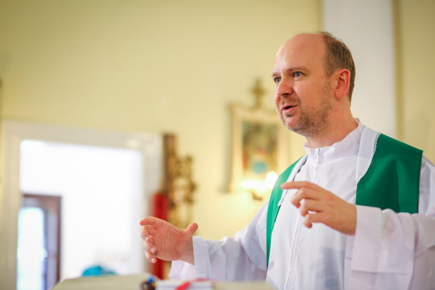 A helyszínül szolgáló homokhátsági Domaszék egykori központja a kis templommal, egy hajdani iskolaépülettel kiegészülve ma az egyházmegye Zöldfás Lelkigyakorlatos Házaként működik. Serfőző Levente, az egyházmegye ifjúságpasztorációs felelőse mutatja be a szentmisét, a most májusban szentelt két diakónus, Aleksza János és Tapodi Krisztián segédletével.