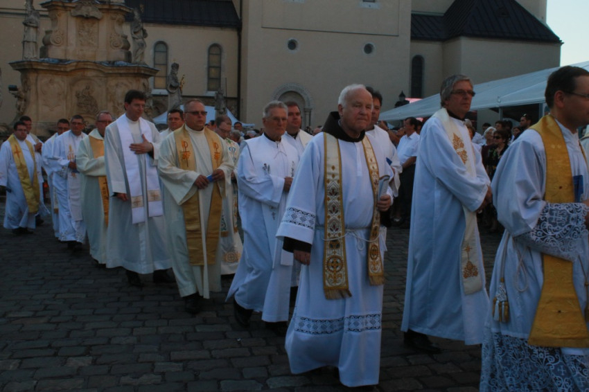 A Szent Mihály-főszékesegyház szűkös befogadóképessége miatt sok százan a Szentháromság téren felállított kivetítőn keresztül kapcsolódhattak be a szertartásba. A szentmise kezdetén Alberto Bottari de Castello nuncius, a Szentszék követe köszöntötte az aranymisést, majd Takáts István érseki kancellár olvasta fel Ferenc pápa köszöntőlevelét.