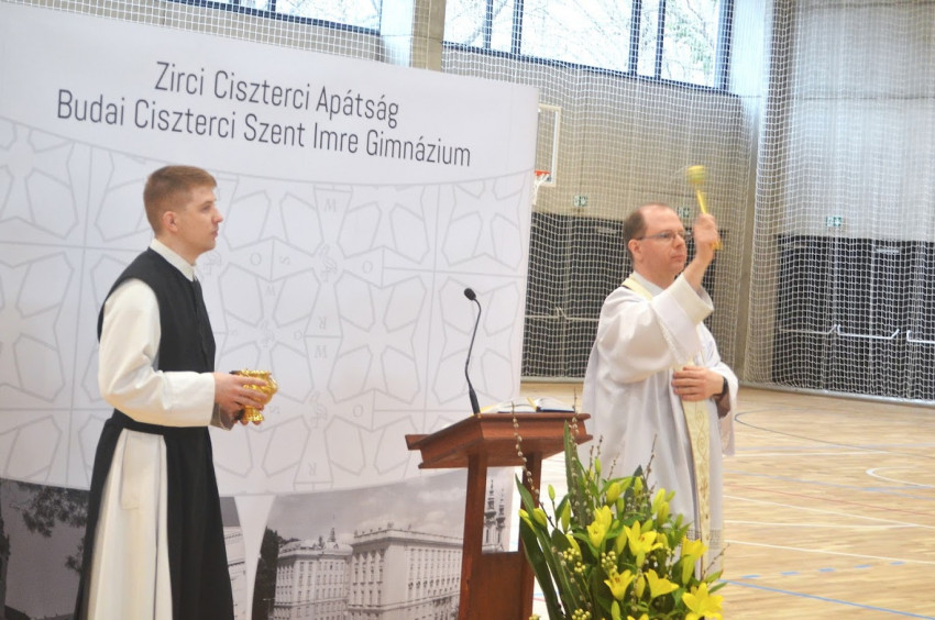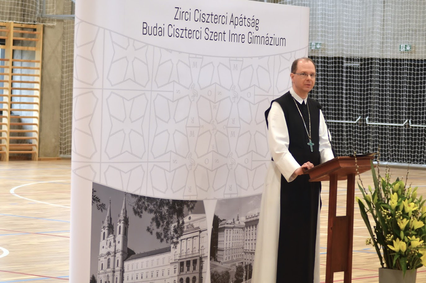 Az avatóünnepségen Bérczi L. Bernát felidézte az iskola megszületését, az akkori ciszterek bátorságát és „nagyot álmodását”, s hogy ebből miként fakadt ennek a mostani nagy álomnak a megvalósulása. Az 1929-ben átadott, eredetileg hatszáz főre és osztályonként heti két testnevelés órára méretezett épületet ugyanis az iskola teljesen kinőtte. Toldozni-foltozni még lehetett volna az épületet, de „ha az ember valóban lángolni és világítani szeretne, akkor messzebbre kell tekintenie”. Szükséges volt tehát egy új sportcsarnok, ebédlő és könyvtár kialakítása, mert ezek hiányát az iskola már hosszú évek óta nagyon megszenvedte. Az új, modern sportcsarnok homlokzatának mintázatáról pedig elárulta, hogy még az is a ciszterci pedagógia lényegéről beszél: a nagyobb, erősebb ciszterci címerek körülveszik a kisebbeket, mintegy felkarolva, segítve, átölelve őket. Ez a ciszterci nevelés lényege is: senkit nem elhagyni, hanem segítve, átölelve együtt haladni a Gondviselő által kijelölt úton.