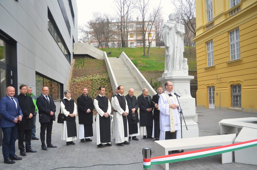 A sportcsarnok megáldását követően a zirci apát vezetésével minden meghívott kivonult az iskola udvarára, ahol Bérczi L. Bernát ünnepélyesen megáldotta az iskola 1950-ben ledöntött, de az építkezéskor csodálatos módon előkerült Szent Bernát-szobrát. Ezt a szobrot a ciszterciek magyarországi működése és újjáéledése jelképének is tekinthetjük, hiszen a kommunizmus egyházüldözésekor elpusztították, elásták, eltüntették, a Gondviselésnek köszönhetően azonban megmaradt és felújítottan, megújulva és megerősödve hirdeti a magyar ciszterciek 800 évnél is régebbi működését.