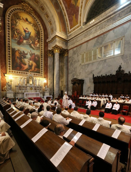 Az előadások után az esztergomi bazilikában a főcelebráns Erdő Péter bíboros abban a miseruhában mutatta be a szentmisét, amely a jövő évi Nemzetközi Eucharisztikus Kongresszusra készült. Múlt, jelen és jövő kapcsolódott össze, hiszen az oltáron az 1938-as kongresszuson használt, felújított kehelyben változtatta át a bort Krisztus vérévé a főpásztor.