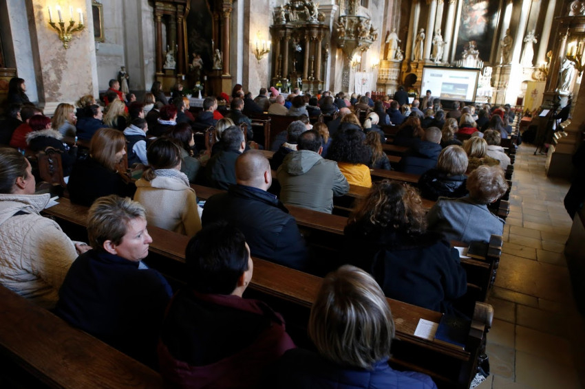 A főtéri Szent Imre-templomban a NEK Általános Titkárságának munkatársai, Farkas Balázs iroda- és gazdasági vezető és Zsuffa Tünde kommunikációs vezető a közelgő nemzetközi eseményről tájékoztatták az elsőáldozásra készülő gyerekek szüleit és hitoktatóit; Bágya János egyházmegyei referens pedig részletesen ismertette a kongresszusra való regisztráció folyamatát.