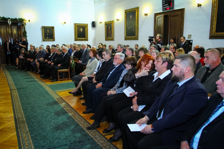 A köszöntések után következett a díjak átadása. A díszpolgári címet Fercsák Róbert polgármester és Zsigó Róbert államtitkár, valamint Csubákné Besesek Andrea és Vedelek Norbert alpolgármesterek adták át.