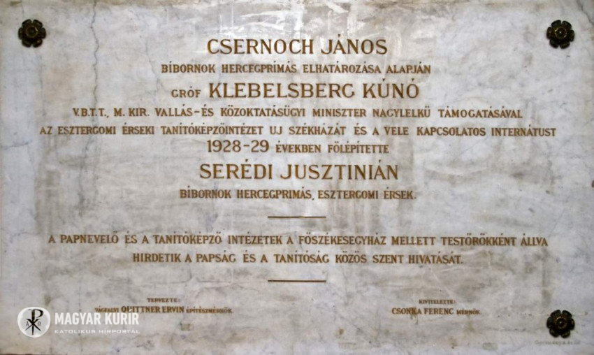 Esztergomban az országban hatodikként indult el az egyházi tanítóképzés, majd Csernoch János bíboros, hercegprímás elhatározása nyomán megépült a Várhegyre néző komplexum. Az elkészült épületet 1928-ban már Serédi Jusztinián bíboros áldotta meg, ekkor kezdte meg itt működését az érseki tanítóképző. „A papnevelő és a tanítóképző intézetek a főszékesegyház mellett testőrökként állva hirdetik a papság és a tanítóság közös szent hivatását” – olvasható az épület falán elhelyezett emléktáblán.