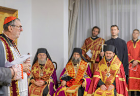 Orosz Atanáz megyéspüspök vezette körbe a bíborost a székesegyházban. Két éve már, hogy a templom megújult, falait gyönyörű ikonok borítják. Ezek közül Orosz Atanáz püspök néhányat, leginkább a ritkán ábrázolt szentek képeit emelte ki.