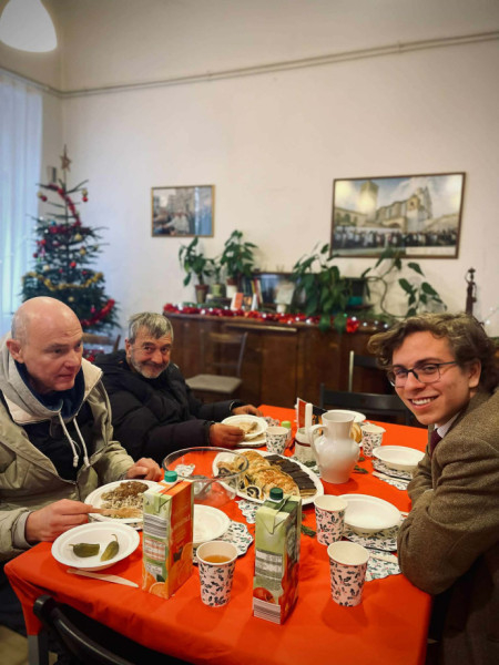 Ezek a gondolatok jutottak eszembe a Sant’Egidio budapesti ebédjén karácsony napján, a Budai Ciszterci Szent Imre Gimnázium gyönyörűen felújított ebédlőjében, amely megtelt fedél nélküliekkel, lakhatási szegénységből, fűtetlen bérlakásokból érkező emberekkel, szociális otthonokban, család nélkül vagy abból kiszakítva élő idősekkel, szegénységben élő családokkal. Fiatal ukrán édesanyákkal, akiknek férjei vagy a fronton, vagy a hátországban védik hazájukat. Az egyik ilyen asztalnál ülő fiatal ukrán anyukák fogadtak barátságukba egy hazánkban menedékre és ösztöndíjra lelő gázai palesztin egyetemista lányt: új barátságok, új ölelések születtek.
