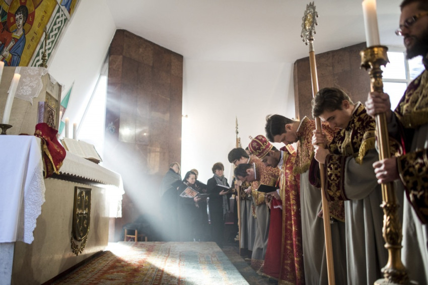 Krikor Badichah, a római XIII. Leó Örmény Kollégium rektorhelyettese (j4) örmény rítusú szentmisét mutat be a budapesti Örmény Katolikus Lelkészség épületében