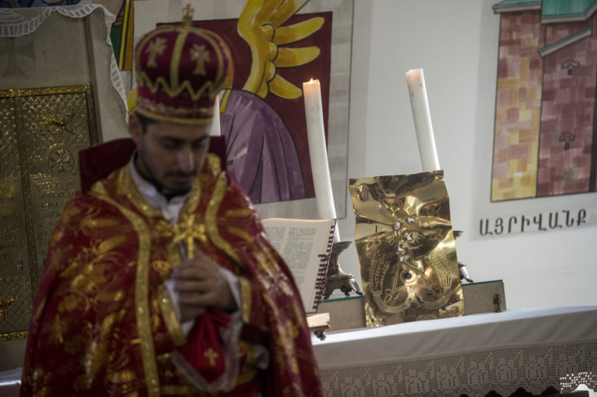 Krikor Badichah, a római XIII. Leó Örmény Kollégium rektorhelyettese örmény rítusú szentmisét mutat be a budapesti Örmény Katolikus Lelkészség épületében 2017. január 8-án. Jobbra a szíriai Keszab városából származó, az Iszlám Állam által megsemmisített örmény katolikus templom szentségházának lőfegyverrel megrongált fedőlemeze