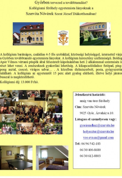 A kollégiumban barátságos, családias 4-5 fős szobák, közösségi helyiségek találhatók. A kápolnában heti két alkalommal mutatnak be szentmisét. Zenészeknek gyakorlási lehetőség biztosított. Futópad, ping-pong asztal, csocsó, virágos udvar ad lehetőséget a kikapcsolódásra.